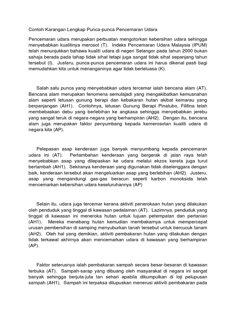 Contoh Karangan Lengkap Punca-punca Pencemaran Udara. Terdapat banyak kesan buruk yang akan menimpa manusia jika langkah-langkah kawalan segera tidak diambil untuk menangani pencemaran. Langkah langkah mengurangkan kesan pencemaran udara.